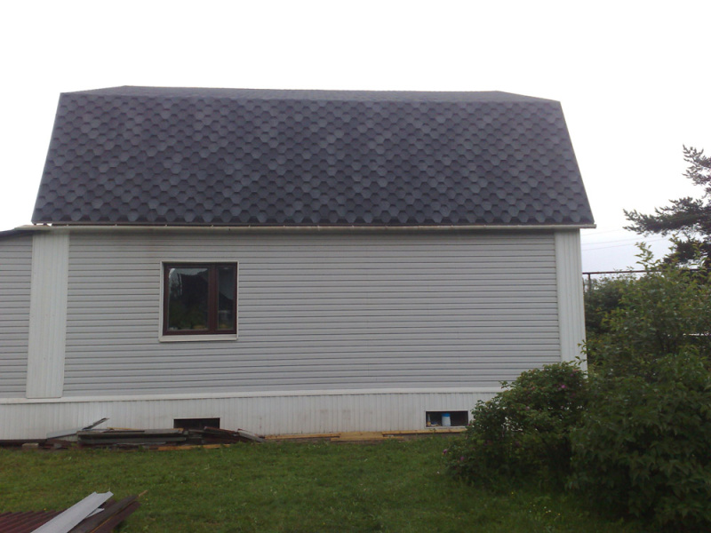 Для домика во Всеволожске, отделанного светло-серый сайдингом, наши специалисты предложили ему купить мягкую кровлю Tegola Нордик Серый с отливом. Она сочетается со светлыми стенами и имеет массу иных достоинств.